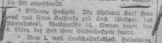 Die Eheleute Karl Herweck und Frau Kathinka geb. Koch (Besitzer des Rheinbades), Waldparkstr.14, können heute, den 6.März 1917, das Fest ihrer Silberhochzeit feiern.